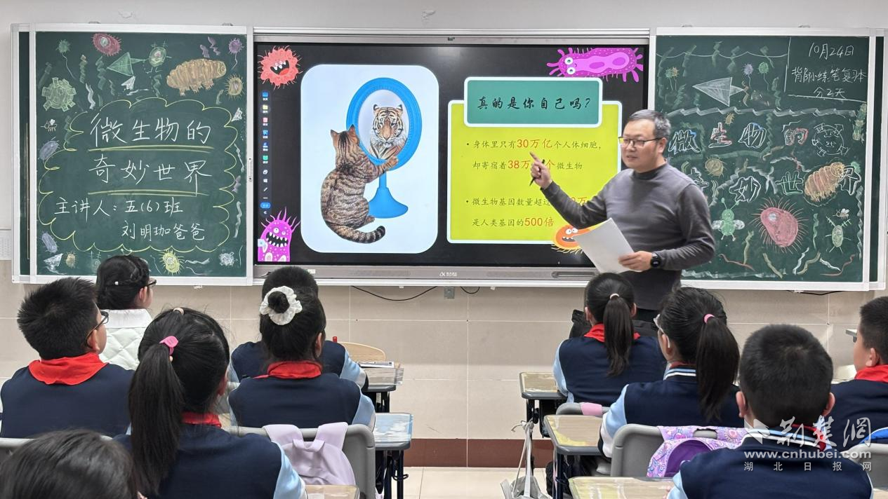 荆楚网(湖北日报)讯(林山记者)10月24日,湖北科技大学刘华西博士走进武昌市果湖第二小学5、6班,以《微生物的奇妙世界》为题,给学生们上了一堂生动的科普课。此次活动是学校“家长课堂”系列活动的一部分。